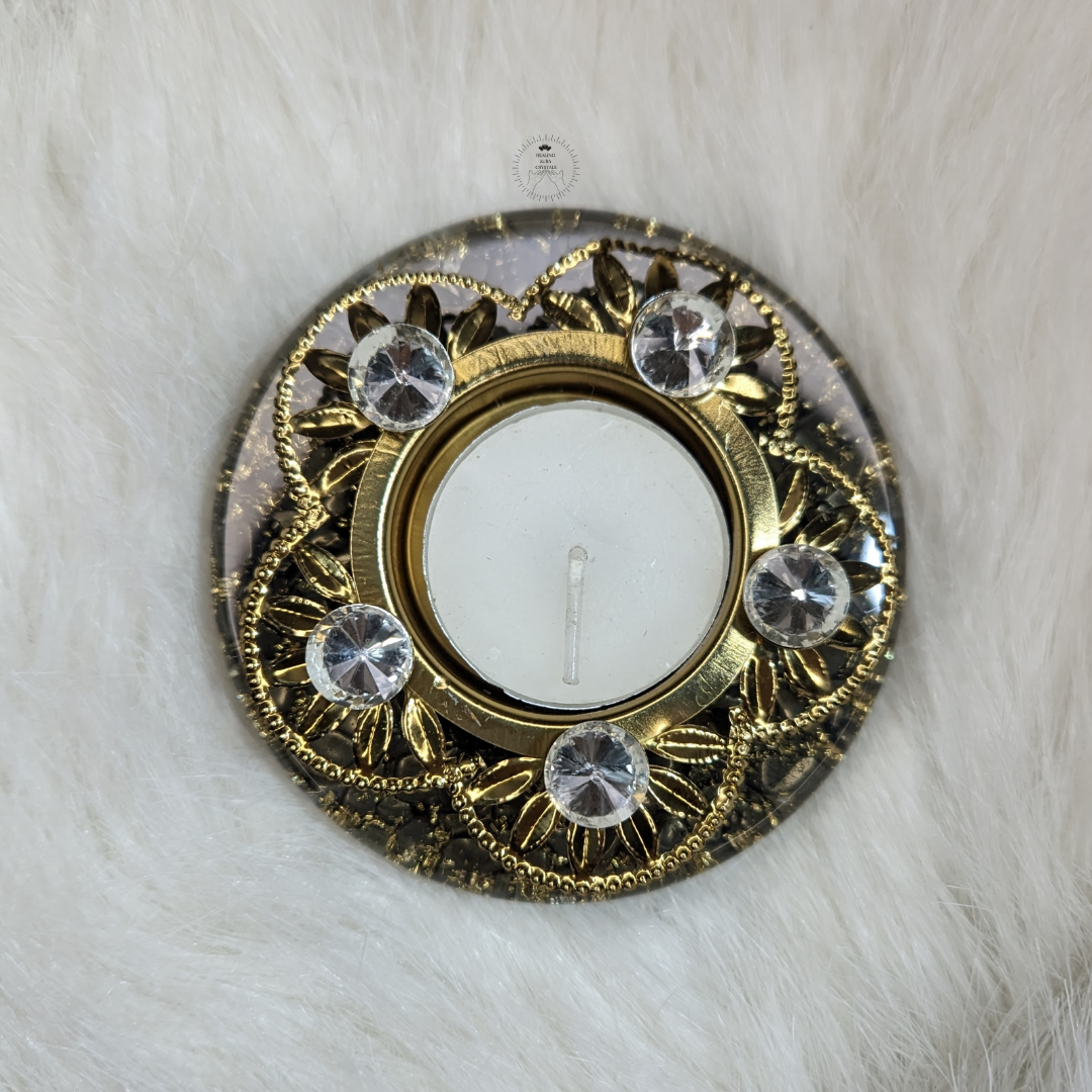 Illuminate your space with prosperity and protection using our Pyrite Tea Light Candle Holder, elegantly designed with a golden floral frame and sparkling crystal accents. The base is embedded with natural Pyrite stones, known as the “Stone of Abundance” for their ability to attract wealth, confidence, and positive energy.