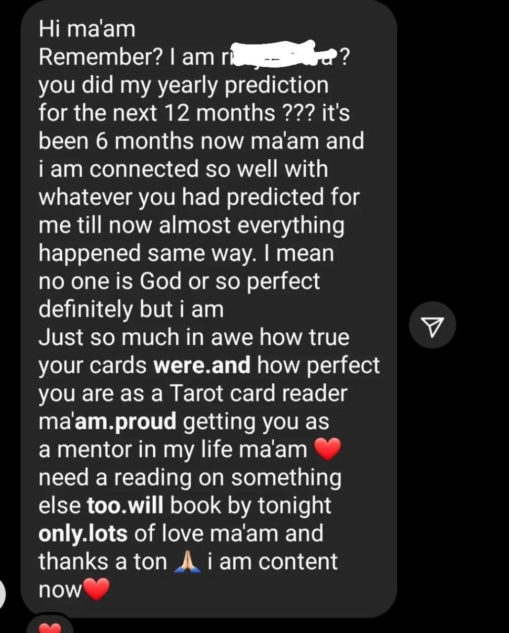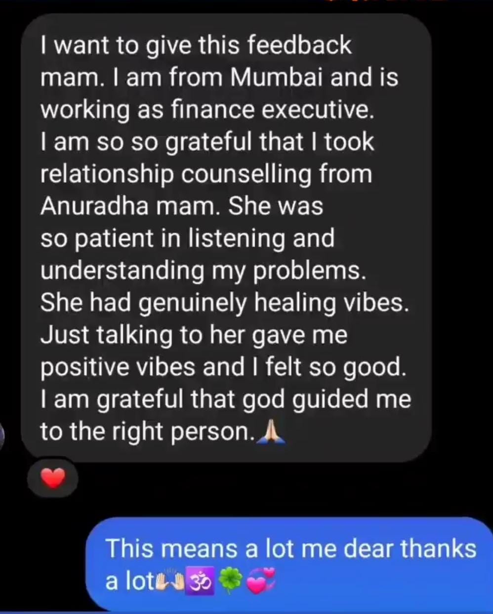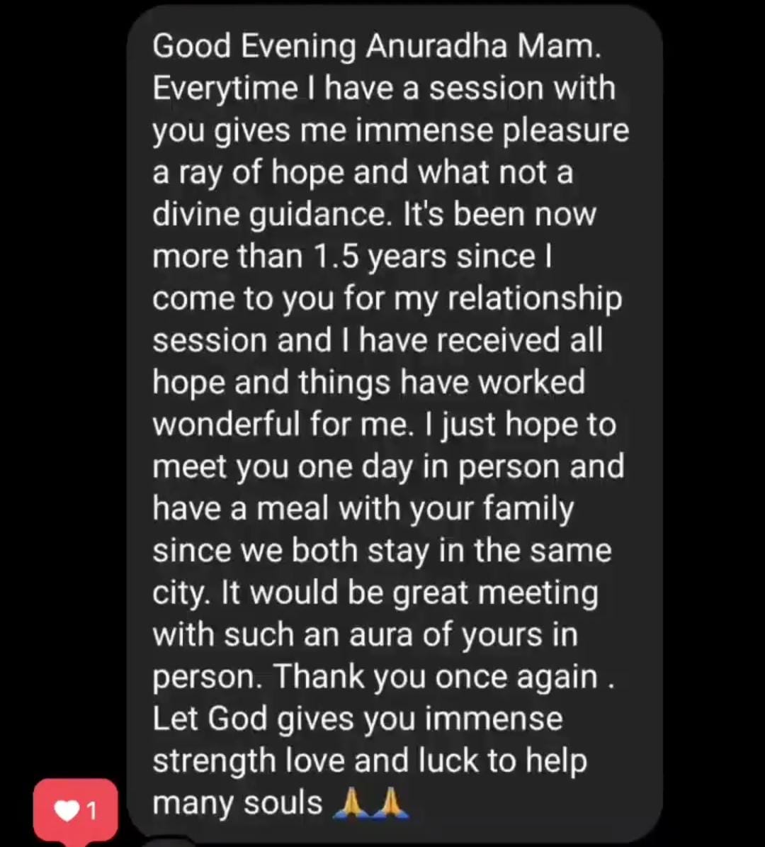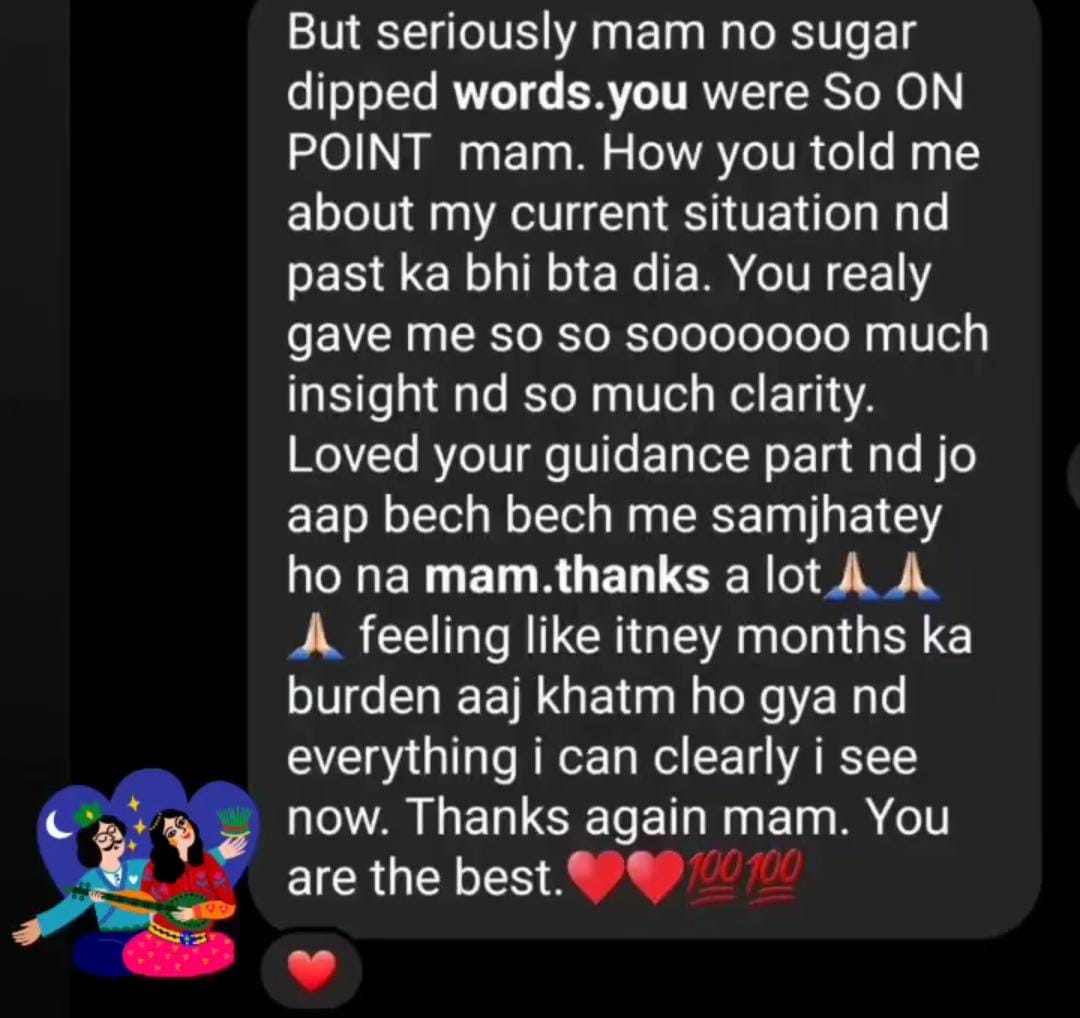 I want to thank Mrs. Anuradha Maam for doing this reading with me. I felt quite happy and optimistic after it. It gave me some new perspectives and strength to believe in to the dreams that I want to accomplish. Highly recommend others to consult her. It’s better to be delayed rather than entering wrong somewhere is what I’ll keep it.