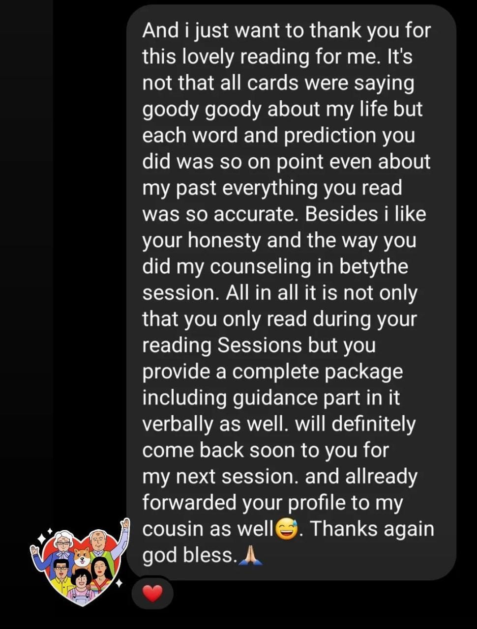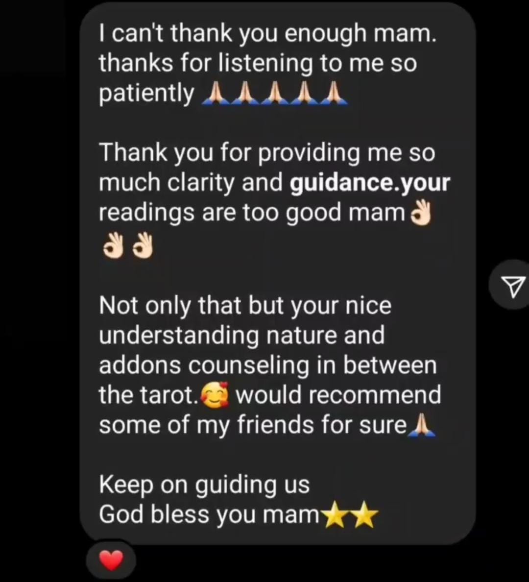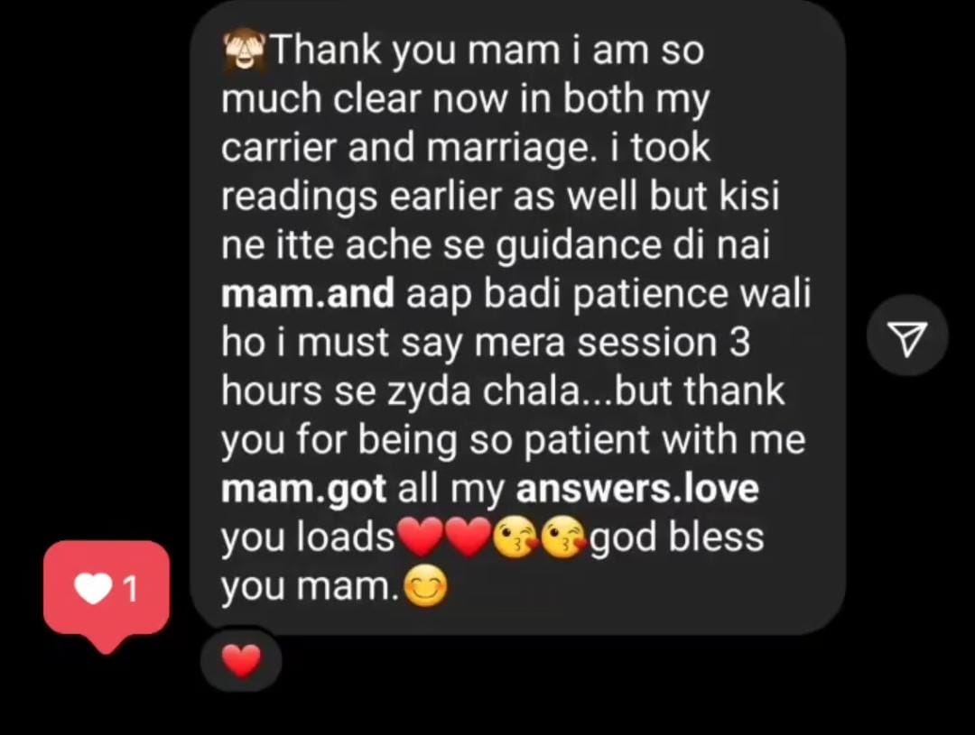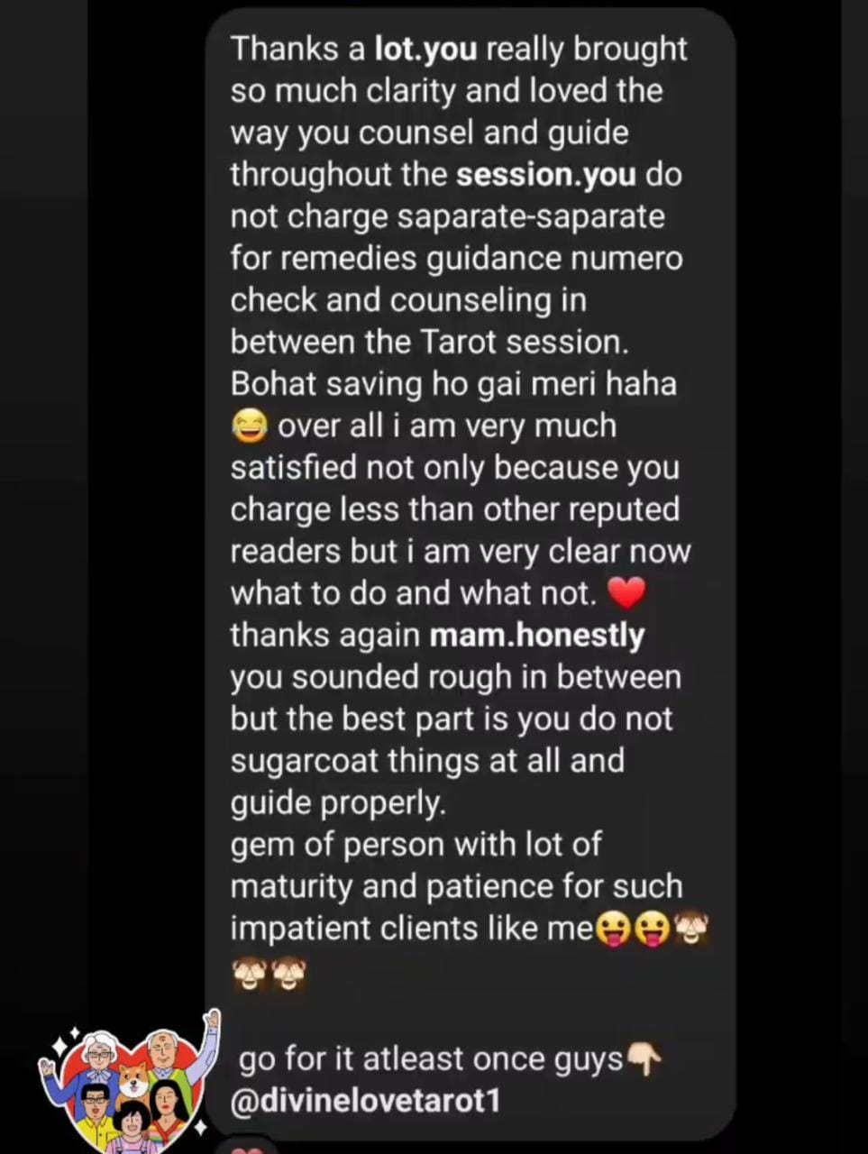 I want to thank Mrs. Anuradha Maam for doing this reading with me. I felt quite happy and optimistic after it. It gave me some new perspectives and strength to believe in to the dreams that I want to accomplish. Highly recommend others to consult her. It’s better to be delayed rather than entering wrong somewhere is what I’ll keep it.